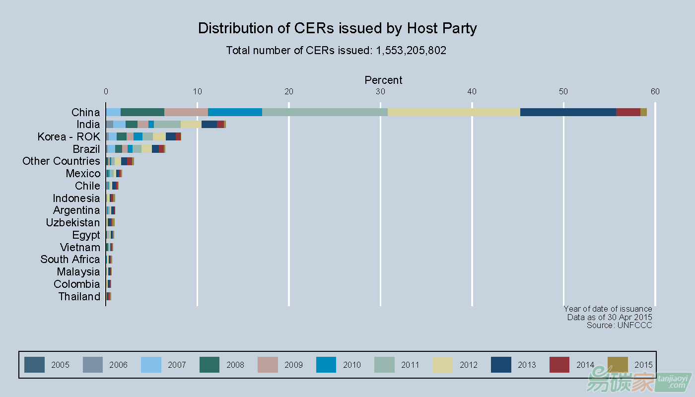 截至2015年04月30日,我國獲得CERs簽發(fā)的CDM項目